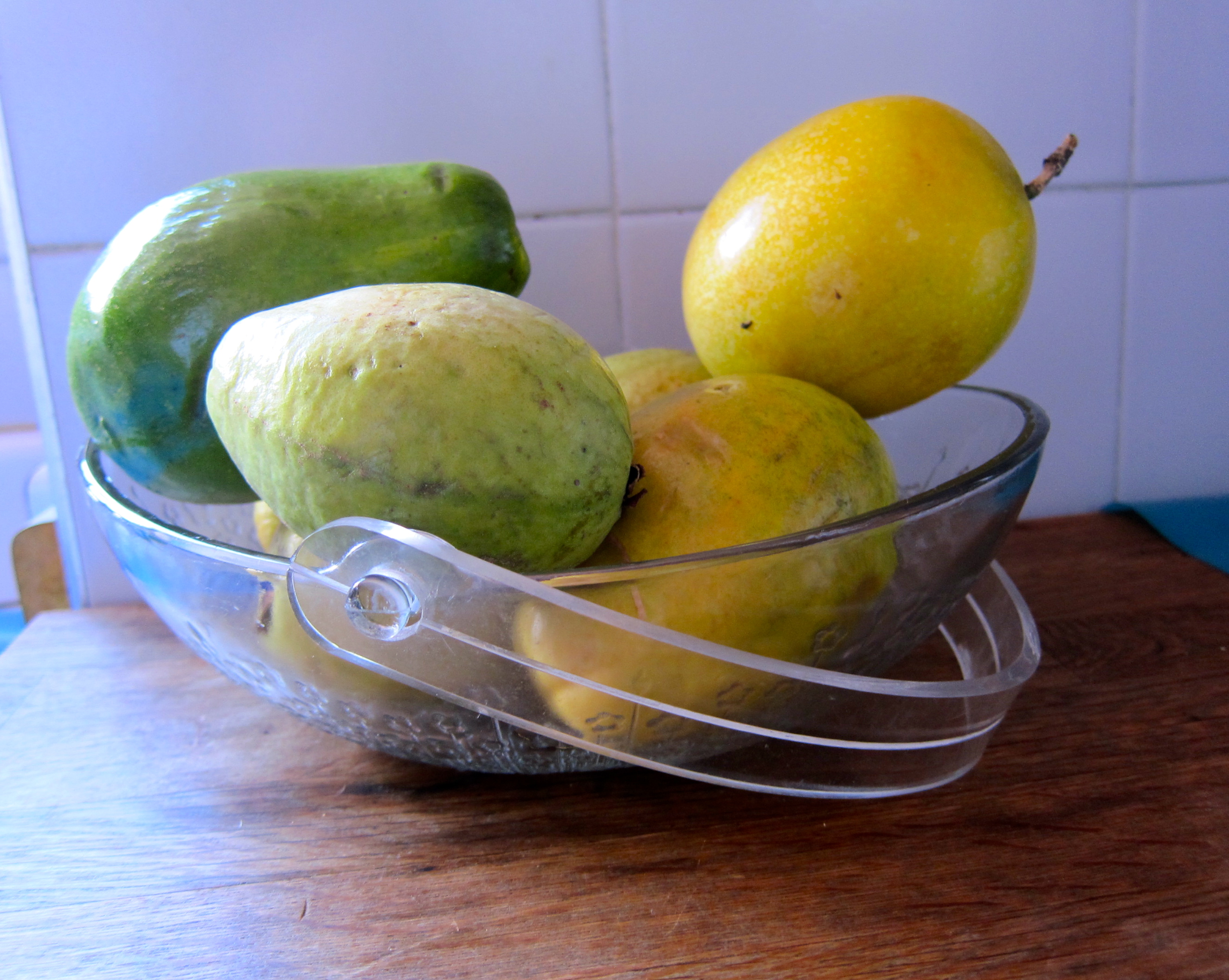Number 3, a bowl filled with fruit, either to eat or with which to make juice. The ones I see are usually made of metal, wood, or glass, and fruits often found here are guanabana, apples, oranges, papayas, mangos, passion fruit, and avocados.